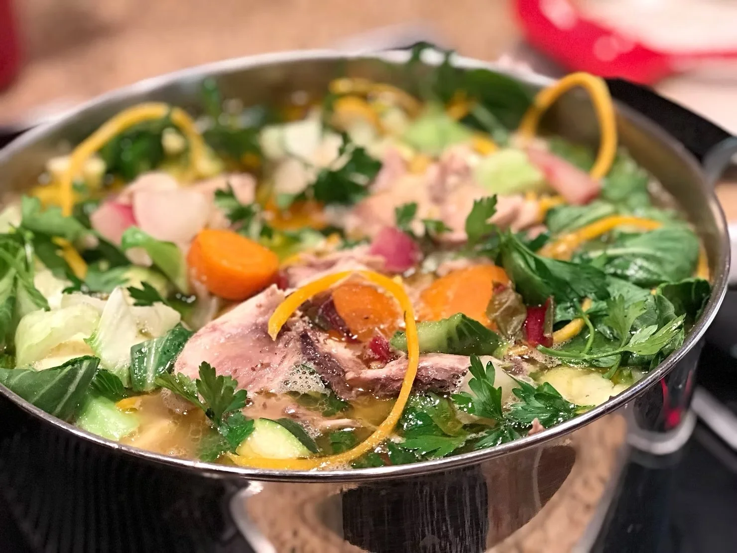 While root vegetables are cooking, debone chicken and add meat back to the soup. Save bones to freeze for future batches of bone broth.